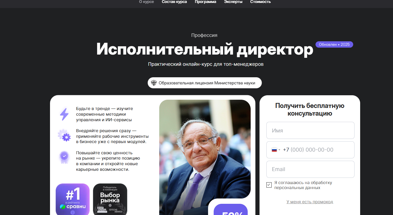 Для специалистов: Исполнительный директор от Eduson Academy — глубокая программа профессиональной переподготовки с 41 практическим кейсом, охватывающая все аспекты работы топ-менеджера от стратегии до операционного управления.