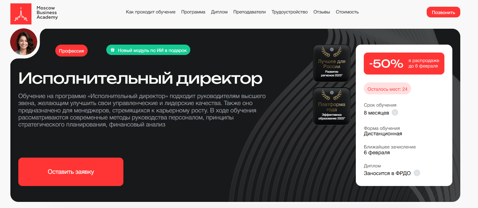 Исполнительный директор от Moscow Business Academy — программа профессиональной переподготовки на 8 месяцев, дистанционная форма обучения, диплом заносится в ФРДО.