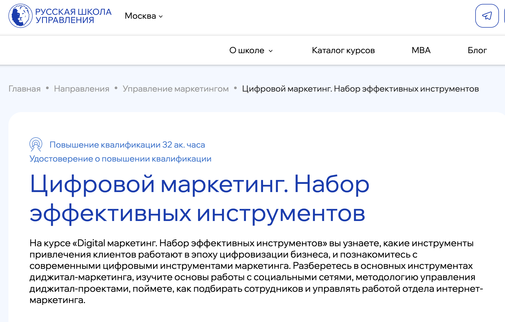 Digital-маркетинг: набор эффективных инструментов — Русская школа управления — практический курс по инструментам цифрового маркетинга, включая email-канал, онлайн-формат.