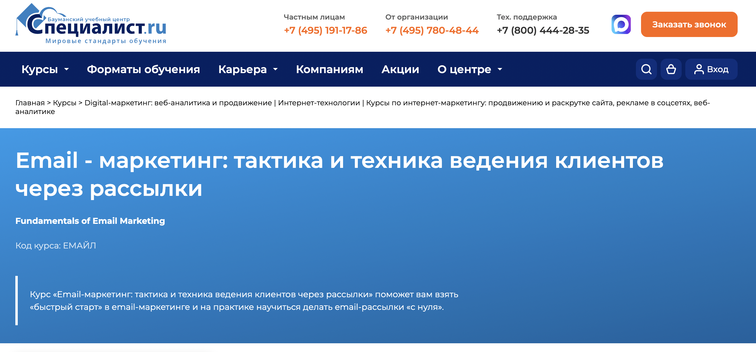 ✨ Курс по email-маркетингу — Специалист.ru — программа обучения email-маркетингу от одного из старейших образовательных центров России. Охватывает основы email-маркетинга, стратегии продвижения через рассылки, работу с инструментами аналитики. Центр «Специалист» работает при МГТУ им. Баумана, что добавляет вес выдаваемым документам.