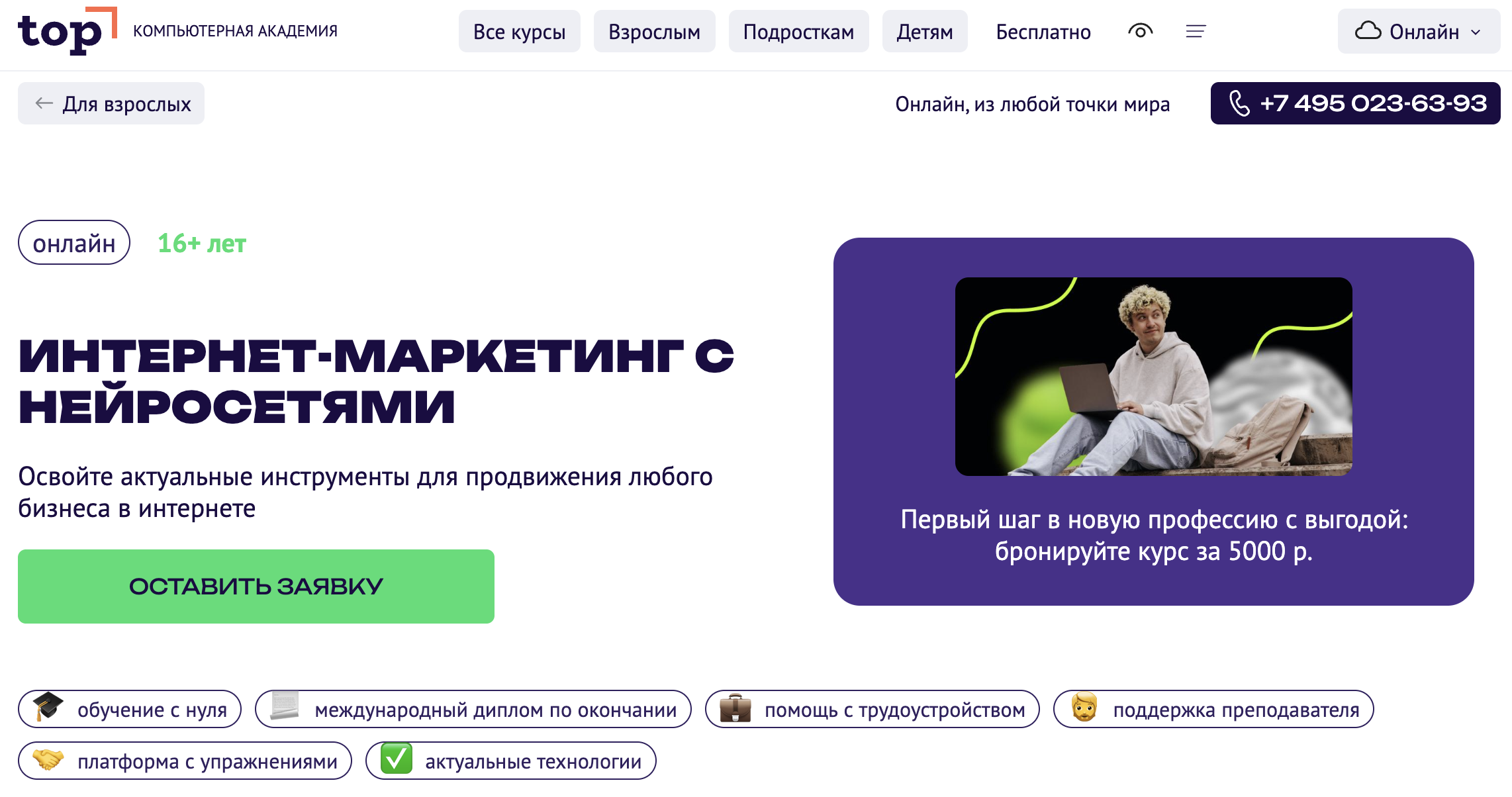 Интернет-маркетинг — ТОП академия — онлайн-курс по интернет-маркетингу с охватом email-канала. Платформа предлагает обучение в цифровом маркетинге с практическими заданиями. Подходит для начинающих специалистов, которые хотят освоить основы интернет-маркетинга комплексно.