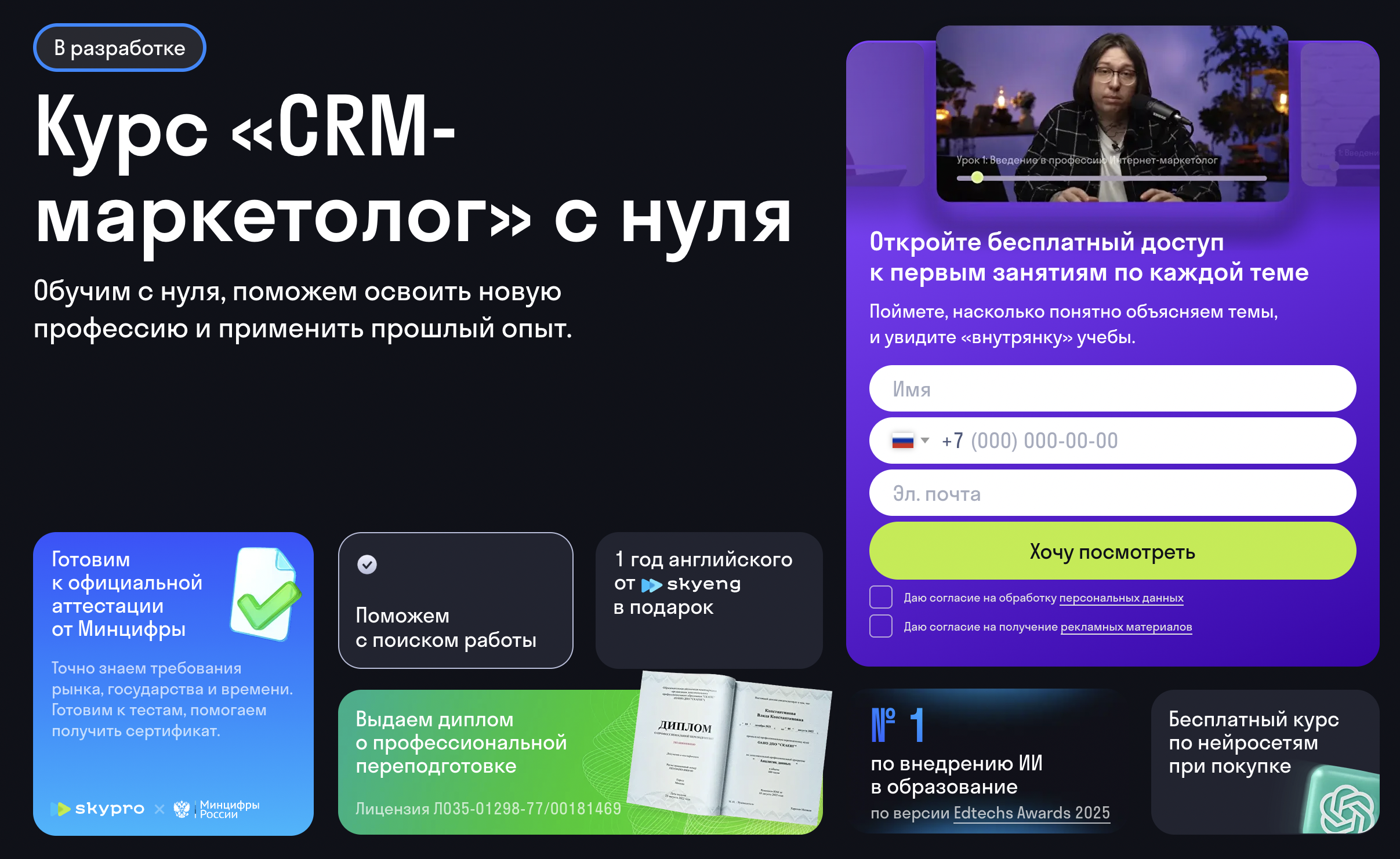 ⭐ CRM-маркетинг — Скайпро — курс по CRM и email-маркетингу с практическими заданиями. Подходит тем, кто хочет освоить сервисы email-рассылок и автоматизацию коммуникаций с клиентами. Программы включают кейсы и проверку домашних заданий наставниками.