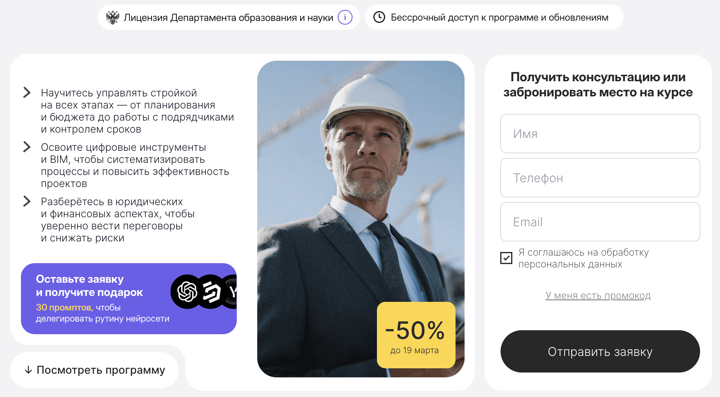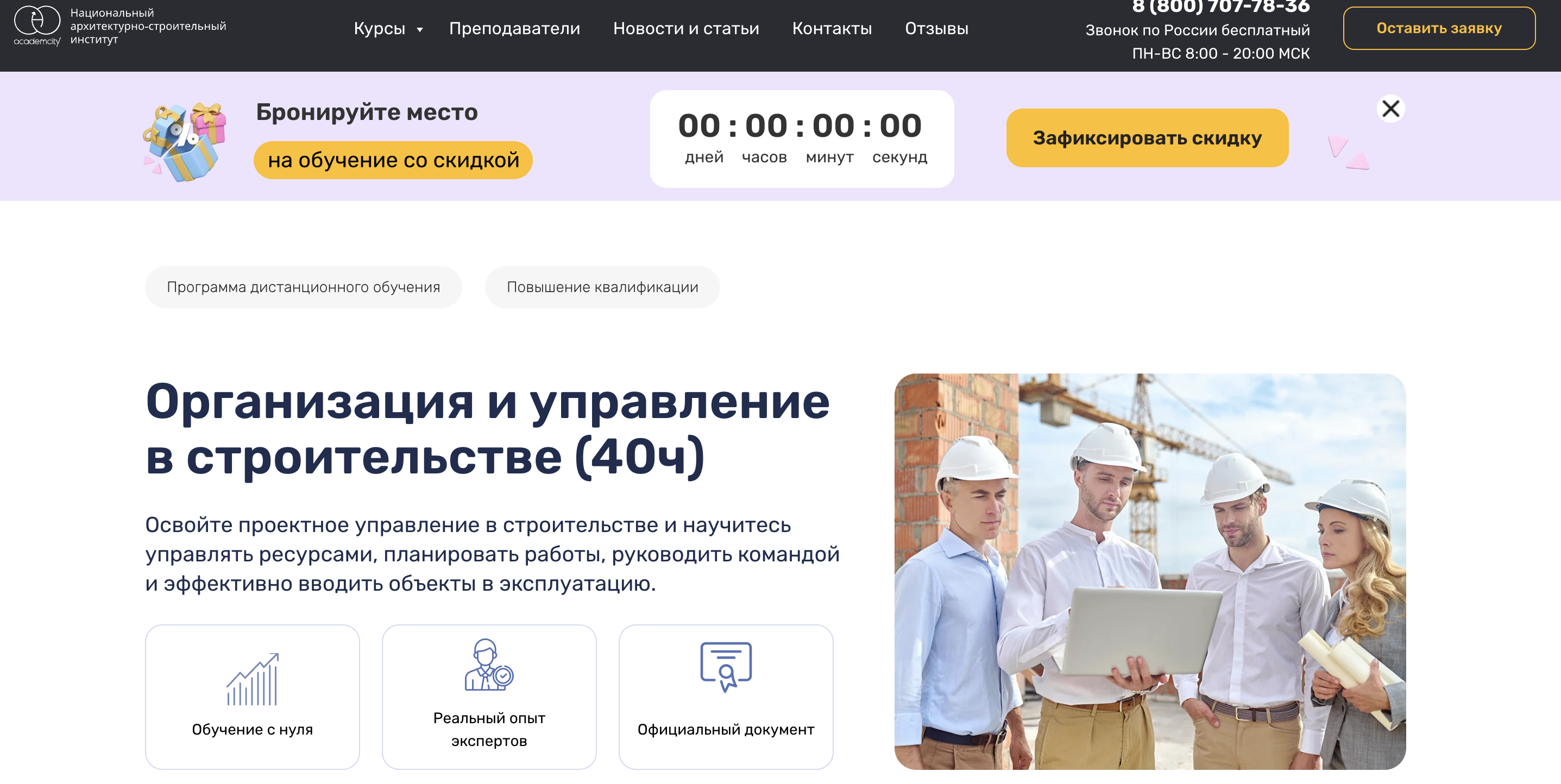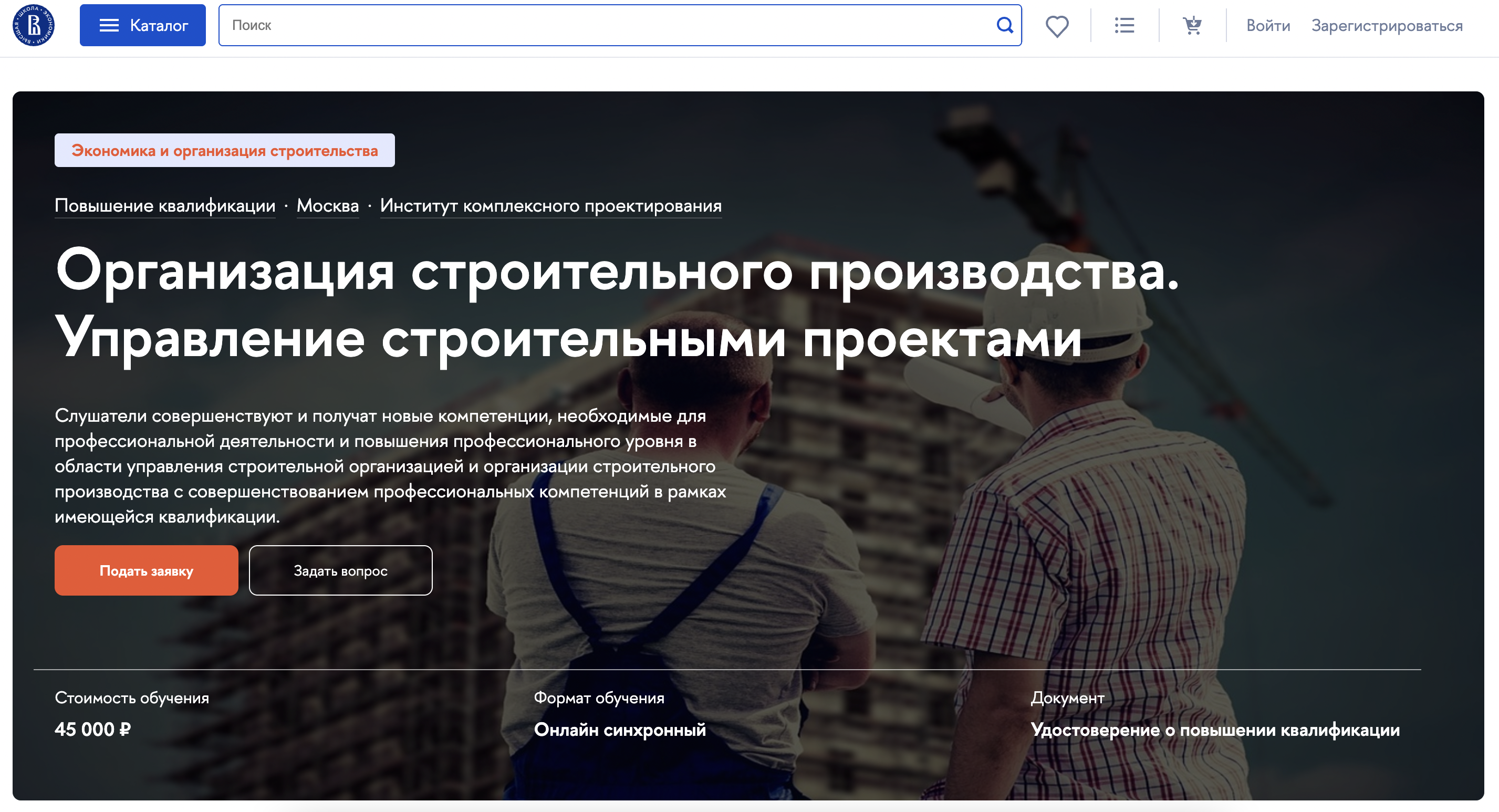 - Трудоустройство: курс не гарантирует работу, но отмечает наличие открытых вакансий и востребованность руководителей строительных проектов