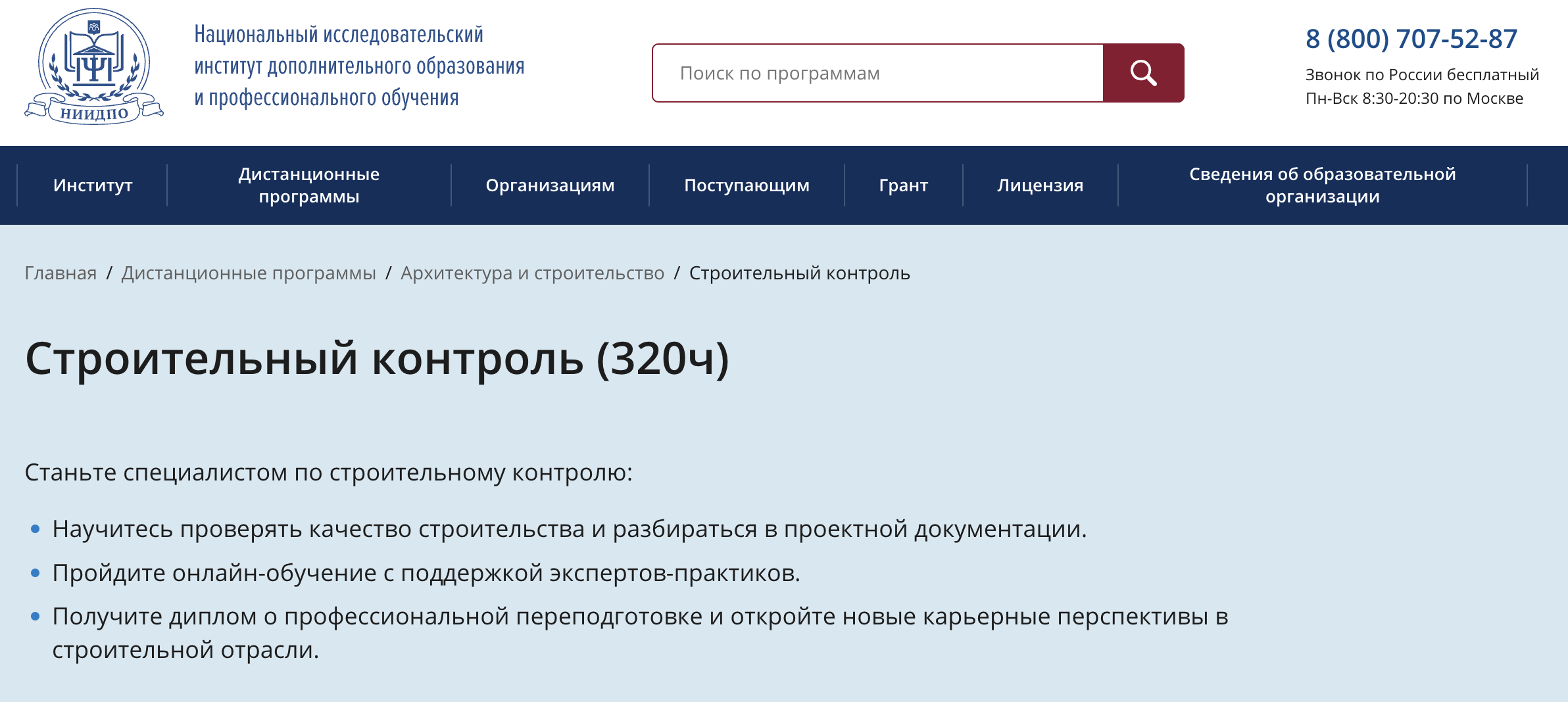 Строительный контроль — Институт НИИДПО — программа для руководителей проектов, занятых в сфере технического надзора и строительного контроля. Охватывает основные требования к проверке строительных процессов, контроль качества на объектах капитального строительства, требования технической документации. По окончании курсов участники получают удостоверение о повышении квалификации.