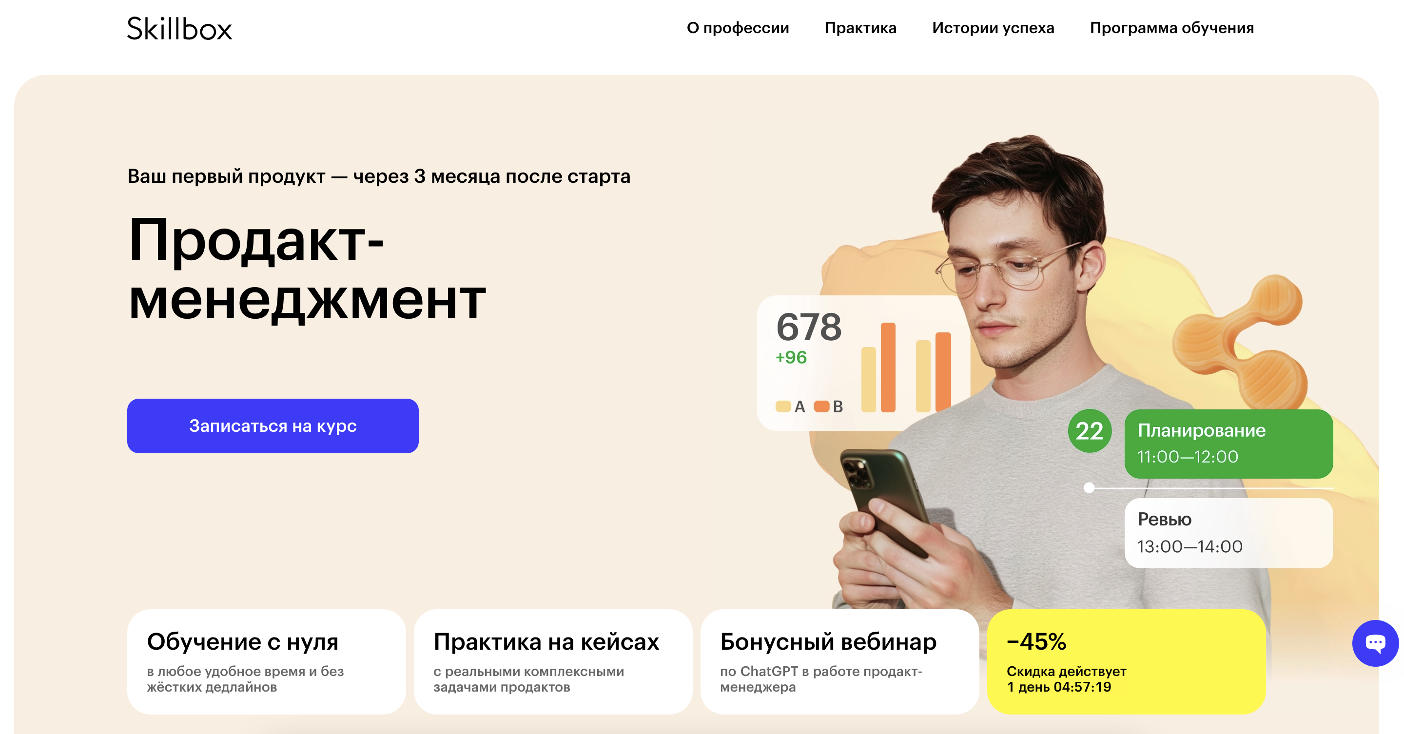 Профессия «Продакт-менеджер» — Скиллбокс — развёрнутая программа для освоения профессии с нуля. Охватывает весь цикл управления продуктом: исследования пользователей, работа с метриками, продуктовую стратегию, управление командой. Формат удобен для самостоятельного изучения в онлайн-формате.