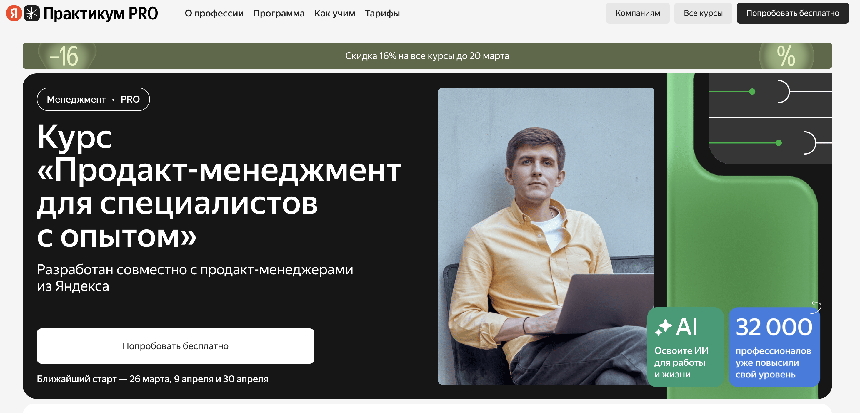 ✨ Продакт-менеджер — Яндекс Практикум — курс от крупнейшей российской ИТ-компании: 18 групповых воркшопов и 14 проектов для портфолио. Программа рассчитана на 9 месяцев, включает карьерную поддержку после выпуска. Опытные специалисты ведут занятия в формате, максимально приближённом к рабочим задачам продакта.