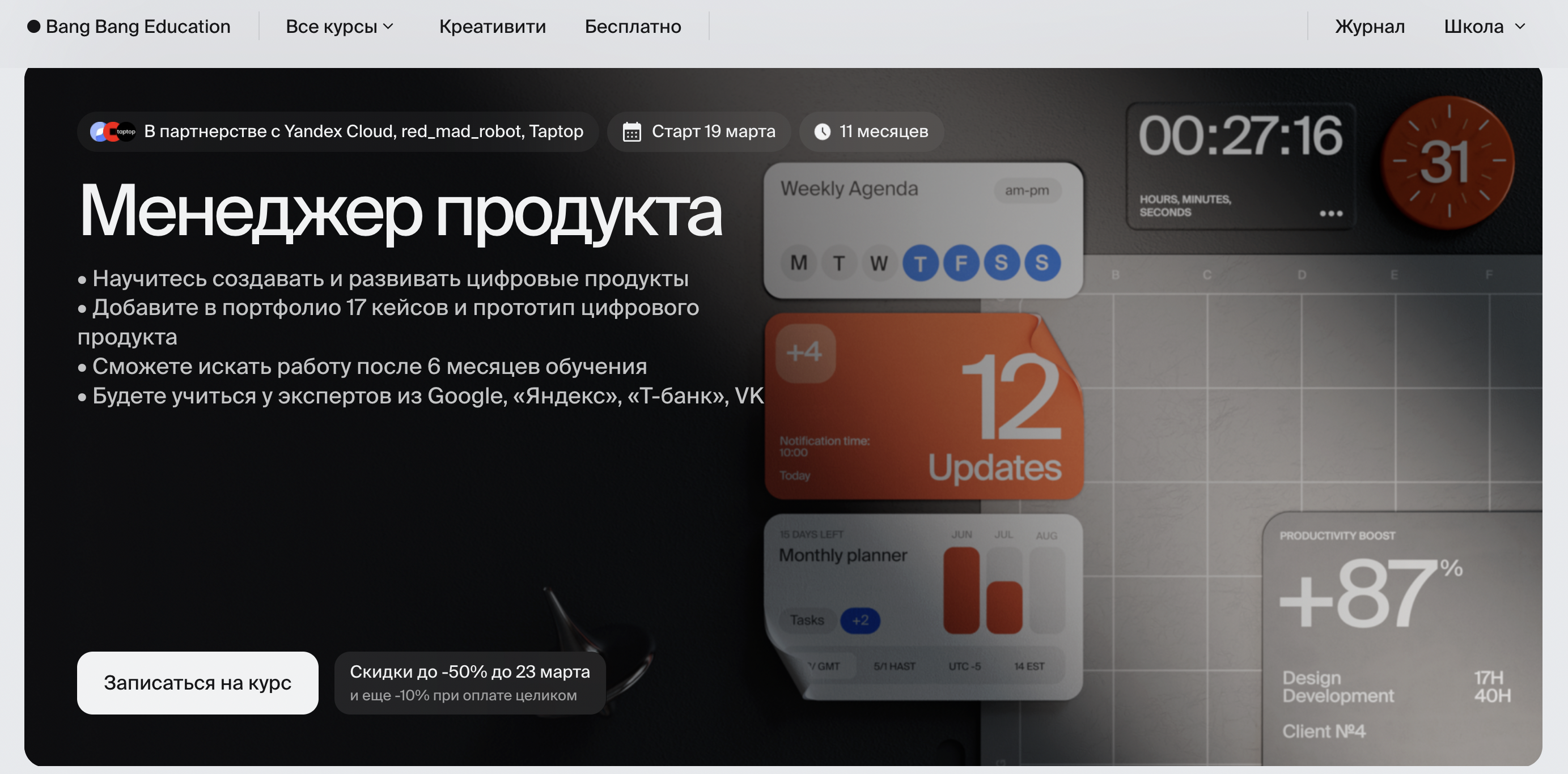 Продакт-менеджер — Бэнг Бэнг Эдюкейшн — онлайн-курс для обучения профессии продакт-менеджера с нуля. Акцент на реальных рабочих задачах и подготовке к трудоустройству, по окончании выдаётся сертификат. Формат удобен для совмещения с основной работой.