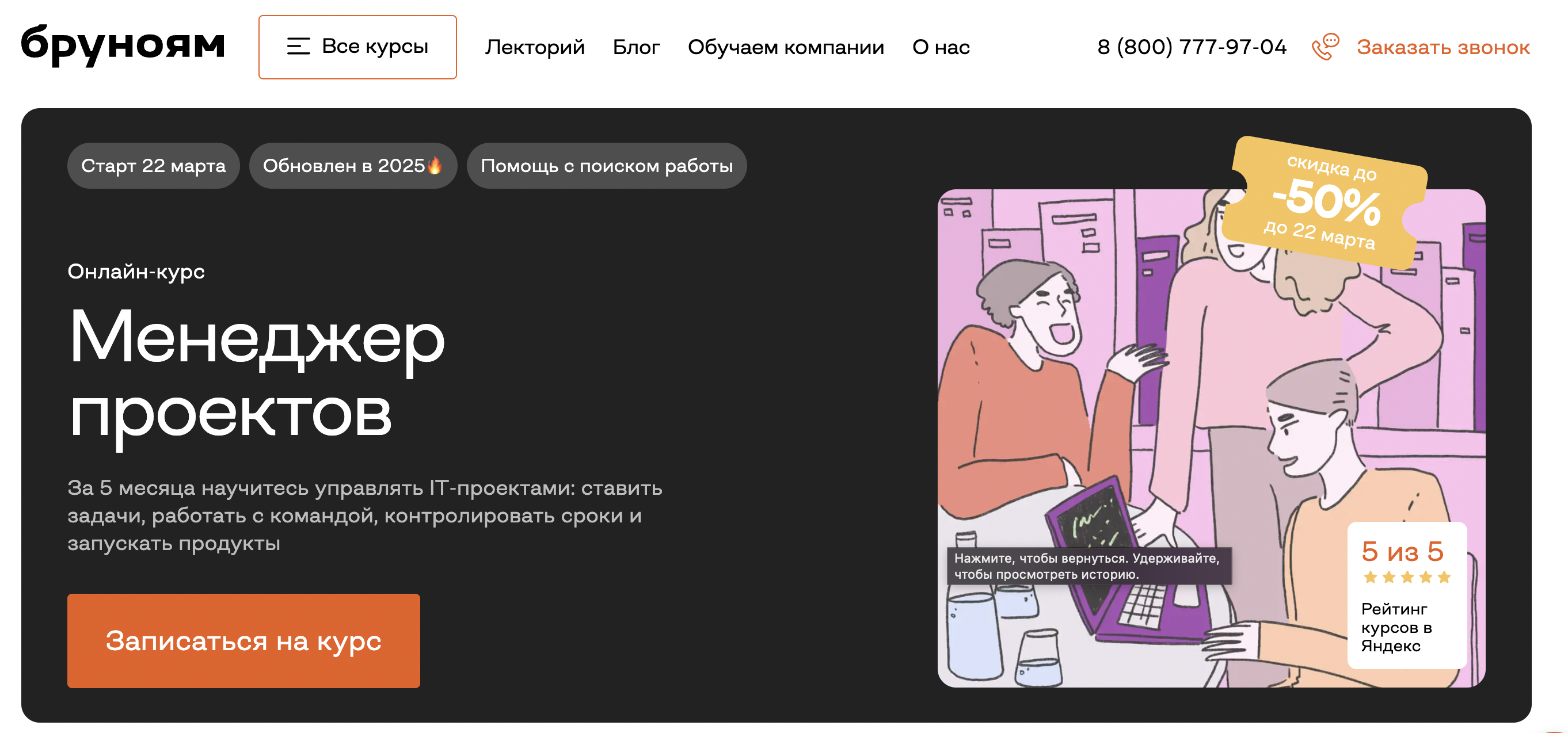 Профессия «Менеджер проектов» — Бруноям — программа с акцентом на практических занятиях и освоении современных технологий управления. Цена зависит от формата, глубины программы и поддержки; условия могут меняться.