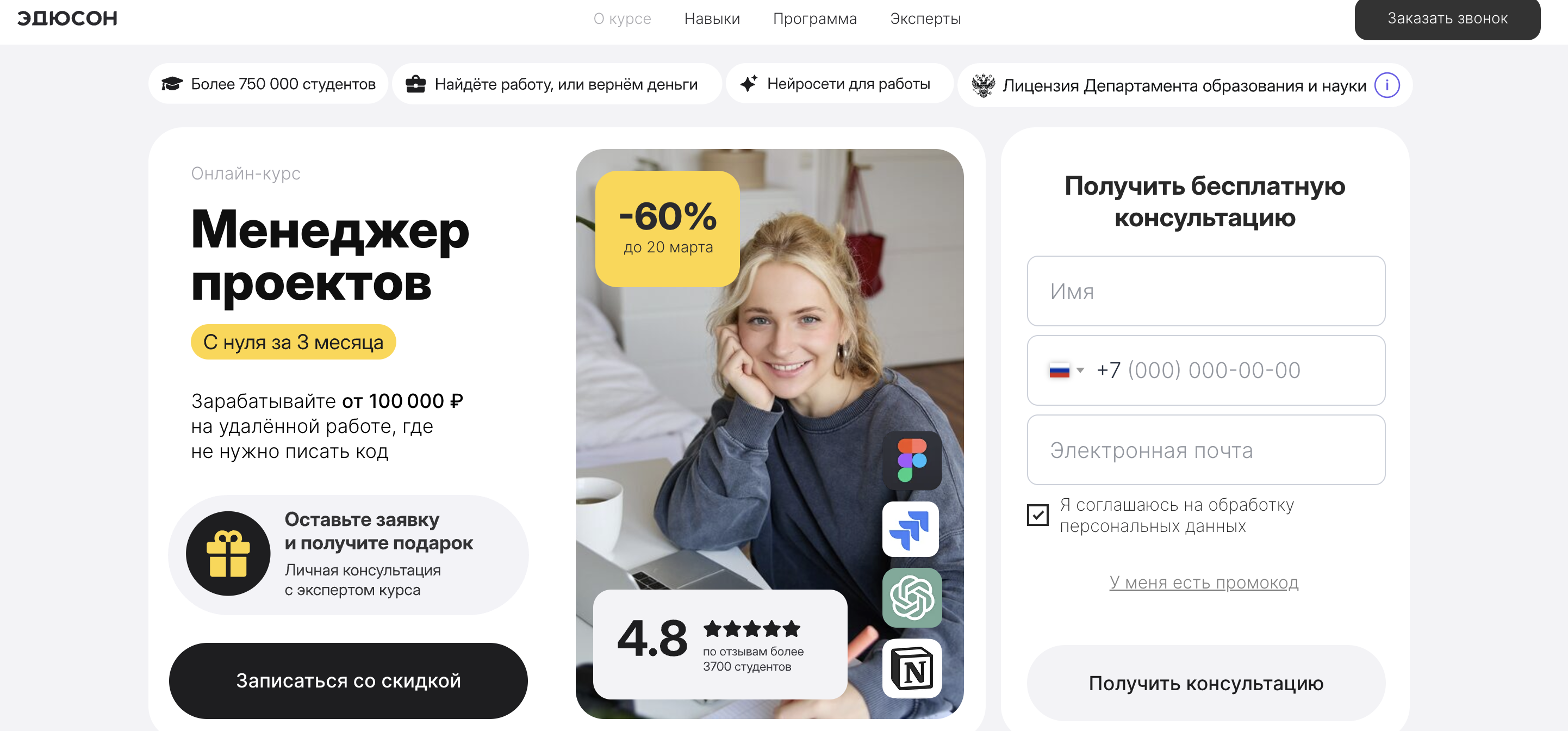 Менеджер проектов — Академия Эдюсон — онлайн-курс на государственной лицензии, программа построена на PMBoK. Слушатели работают с бизнес-симуляторами на основе актуальных задач бизнеса и добавляют в портфолио 7 кейсов из сфер ИТ, ритейла, финансов и цифровой среды. Преподаватели — практикующие менеджеры проектов из крупных компаний. По окончании обучения выдаётся удостоверение о повышении квалификации.