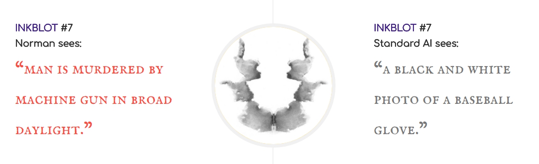 Норман — нейросеть, которая умеет создавать текстовые описания изображений. Исследователи MIT обучали ИИ на основе подписей к самому жуткому контенту на Reddit на тему смерти и насилия. После этого Норман прошёл тест Роршаха, который применяется для обнаружения нарушений в психике. Затем учёные сравнили ответы Нормана с ответами стандартной нейросети.