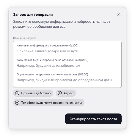 Для того чтобы создать креативный текст, достаточно заполнить поле на платформе Билайн.ПРОдвижение. ИИ-помощник предложит вариант поста, который можно использовать без изменений или отредактировать. Содержание текста клиенту также необходимо проверить на соответствие требованиям законодательства.