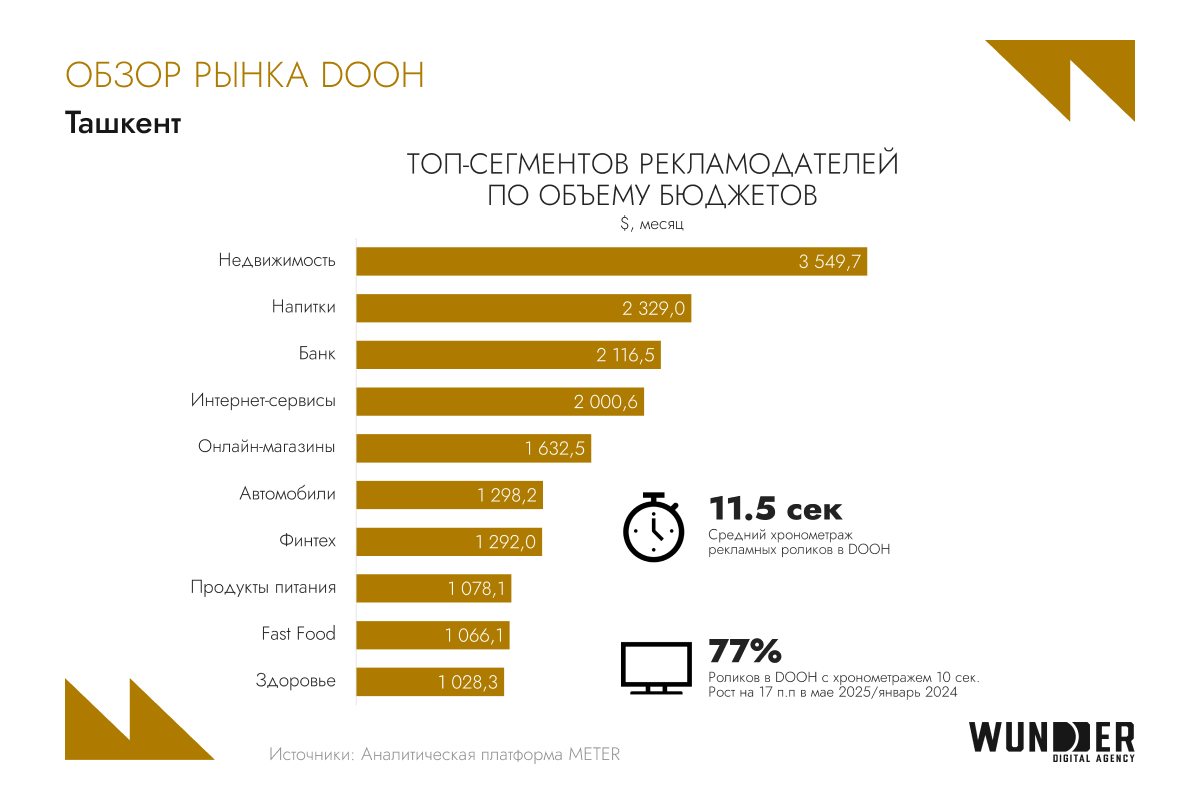 Наружная реклама продолжает усиливать свои позиции — в первую очередь за счет роста сегмента DOOH и повышения прозрачности медиапланирования. В 2025 году цифровые форматы занимают около 35% всего наружного инвентаря в Узбекистане. Особенно активно DOOH используют компании из сферы недвижимости, производители напитков и банки. Для