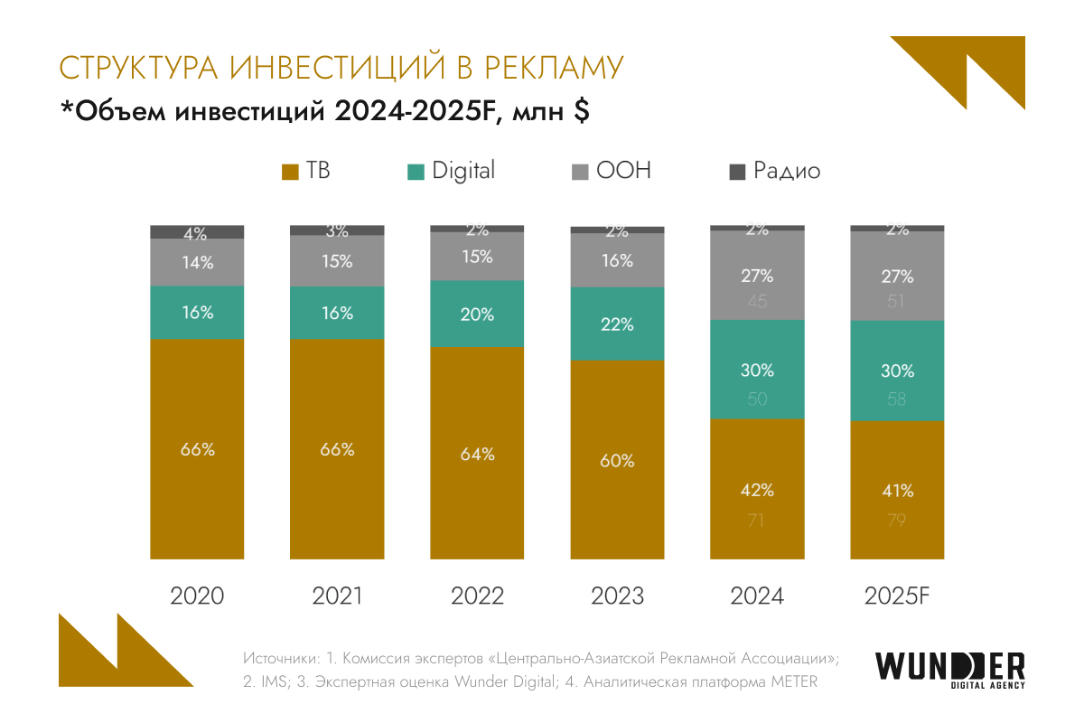 Телевизионная реклама все еще сохраняет статус ключевого канала по объему инвестиций, однако ее доля постепенно снижается. На первый план выходит digital — сегодня это основной драйвер роста. Начиная с 2021 года цифровой сегмент практически удвоил свою долю и в 2025 году и, по прогнозам, закрепит за собой около 30% медиарынка. Это во многом обусловлено ростом интереса со стороны крупных локальных и международных брендов, которые все активнее перераспределяют бюджеты в