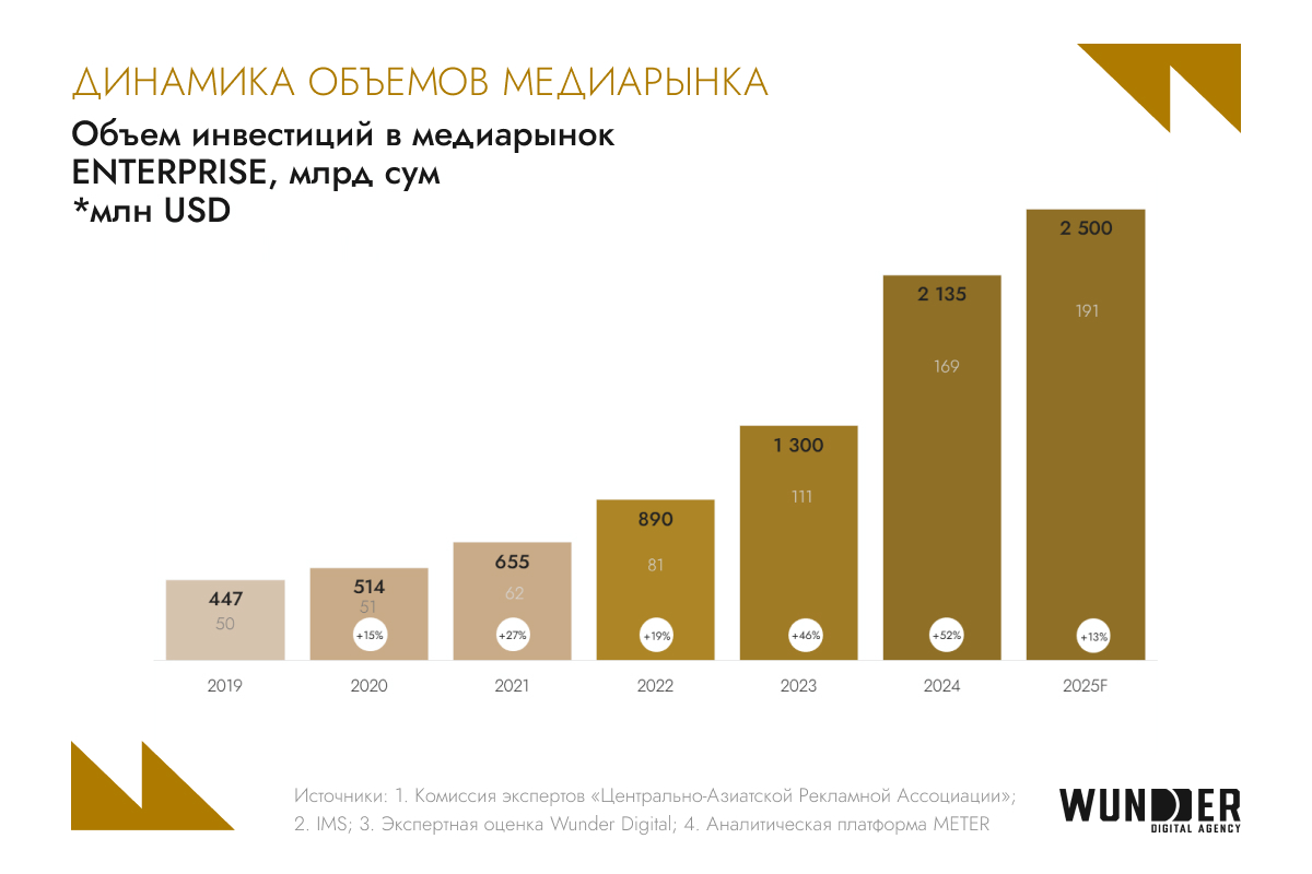 Однако именно digital сегодня становится центром притяжения новых бюджетов, инновационных решений и высоких ожиданий по эффективности. С 2019 по 2025 объем инвестиций в digital вырос с 67 до 753 млрд сум в год — увеличение в более чем 11 раз отражает масштабные изменения в стратегиях размещения как крупных, так и средних игроков. При этом важным участником цифрового рынка стал малый и средний бизнес. Несмотря на ограниченные бюджеты, именно массовость размещений со стороны МСБ значительно влияет на конкуренцию в рекламных аукционах.