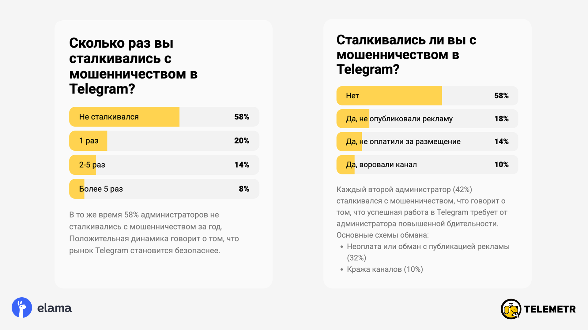 Проблемы с мошенничеством — реальны: 42% администраторов сталкивались с обманом (неоплата, неразмещение, кражи каналов и так далее). При этом лишь 17% подали данные в регулятора или прошли формализацию, многие ещё не достигли порога подписчиков или не знают процессов.