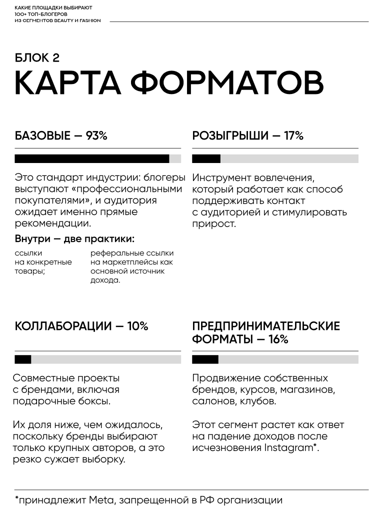 16% — собственные предпринимательские форматы. Продвижение собственных продуктов: курсов, брендов, магазинов, салонов красоты, косметологии, закрытых клубов. Это стремительно растущее направление — реакция на падение рекламных доходов после исчезновения Instagram*;