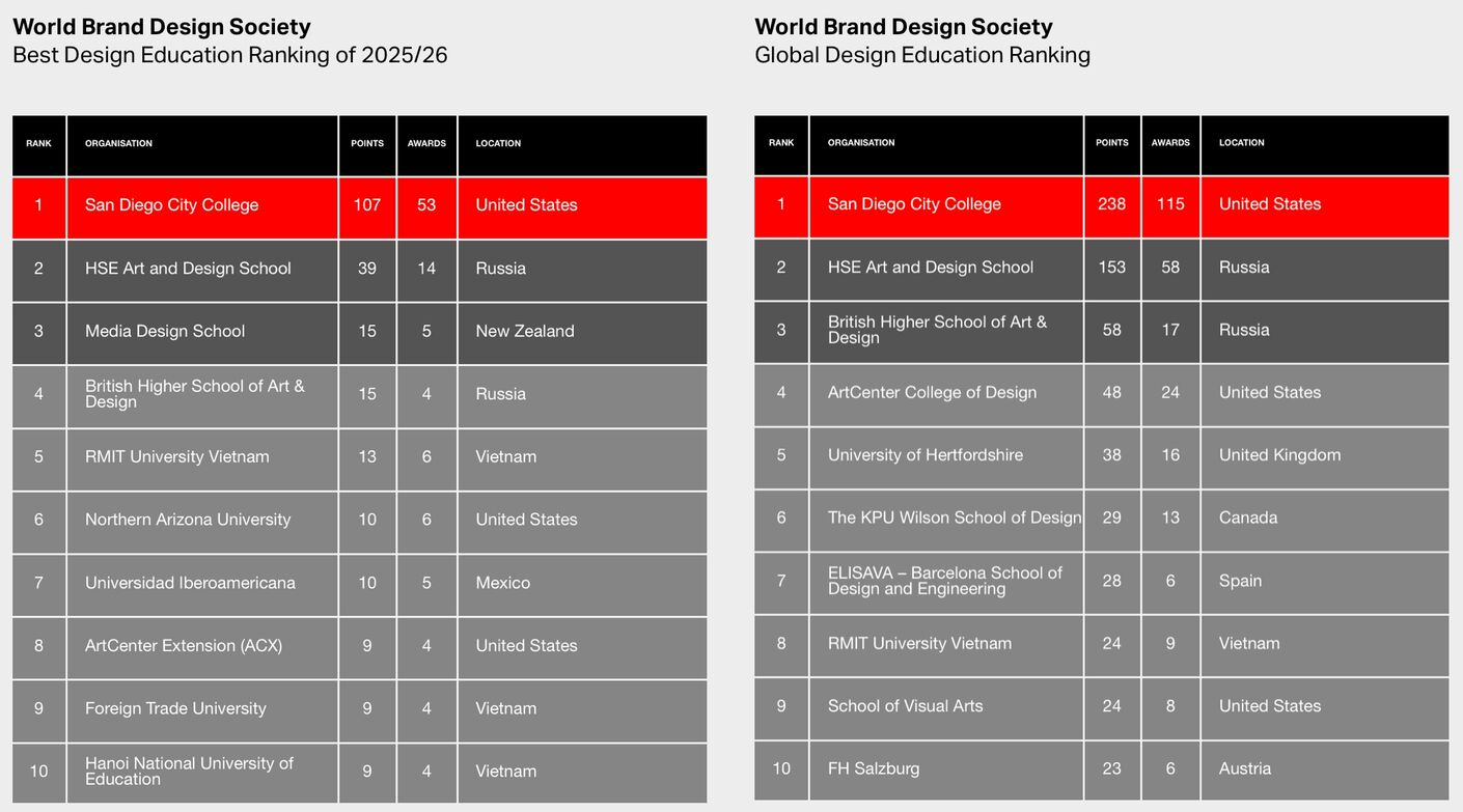 Благодаря победе и призовым местам, в сезоне 2025/26 Школа дизайна НИУ ВШЭ заняла второе место в Глобальном рейтинге образования в области дизайна и в рейтинге лучших учебных заведений сезона 2025/26 по версии WBDS, уступив лишь Городскому колледжу Сан-Диего.