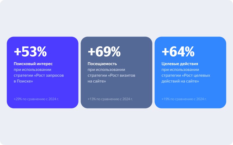 В 2025 году эффективность стратегий под управлением ML выросла. По сравнению с 2024 они стали приносить брендам на 29% больше поисковых запросов, на 13% больше визитов на сайт и на 19% больше целевых действий.