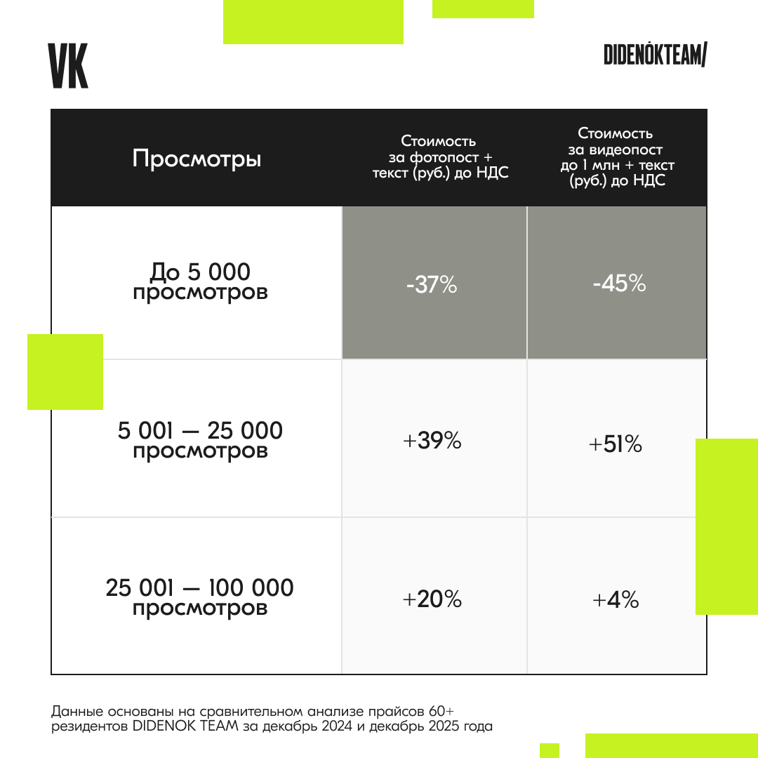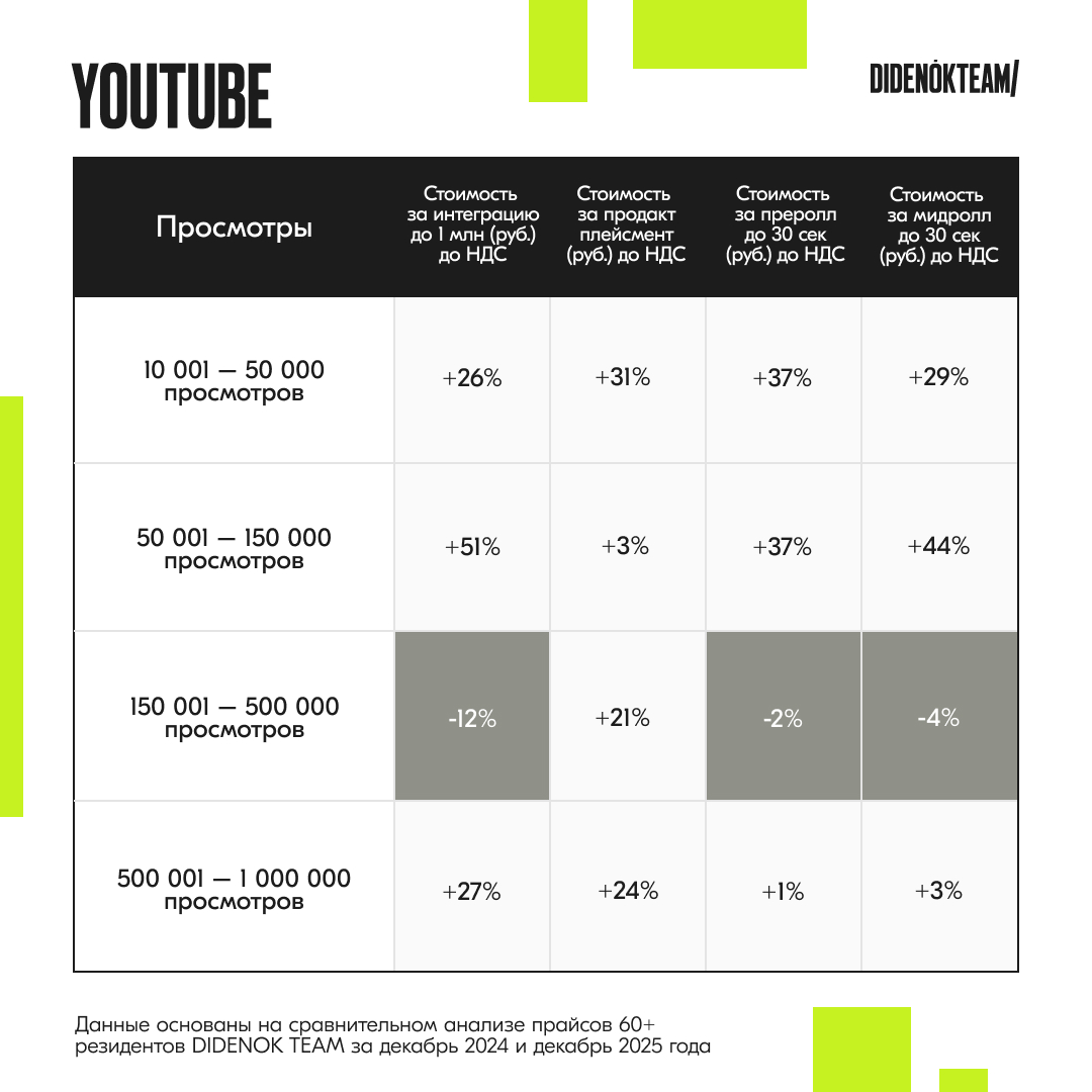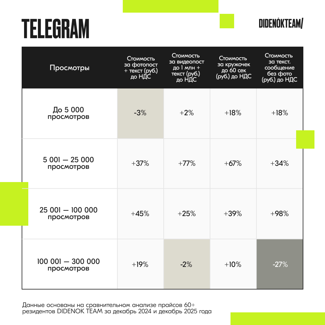 Команда коммуникационного агентства DIDENOK TEAM проанализировала, как изменились цены на рекламу у блогеров в Telegram, VK и YouTube. В выборку вошли данные 60+ эксклюзивных резидентов агентства за декабрь 2024 и декабрь 2025 года. Резидентов сегментировали по количеству просмотров и вывели средние стоимости в каждой категории. Итак, насколько изменились цены?
