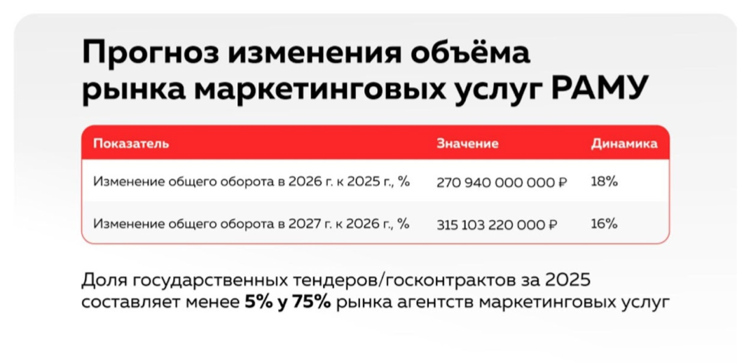 «Прогноз роста рынка маркетинговых услуг на +18% в 2026 году и +16% в 2027 году — это не эффект „хорошего настроения экономики“. Это следствие давления, в котором сегодня находится бизнес, —