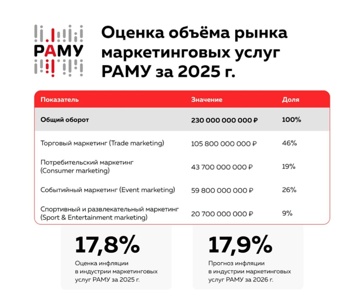 Российская Ассоциация Маркетинговых Услуг (РАМУ) обновила методологию расчёта объёма рынка маркетинговых услуг. По новой оценке, по итогам 2025 года рынок достиг 230 млрд рублей. Это на 80% больше по сравнению с показателями 2024 года. При этом инфляция в индустрии маркетинговых услуг — включая рост проектных, операционных и финансовых затрат — за 2025 год, по оценке экспертов, составила 17,8%. Методология комплексной оценки объёмов рынка маркетинговых услуг была разработана Аналитическим центром российской индустрии рекламы (АЦ РИР).