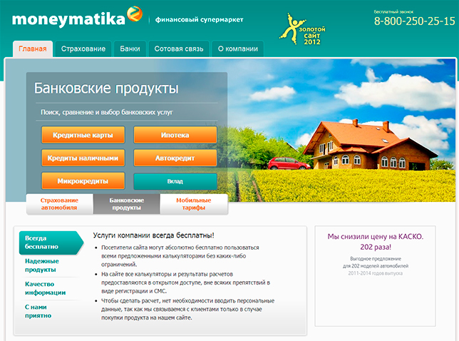 Сайт Moneymatika предлагает своим пользователям бесплатную возможность сравнения и калькуляции стоимости услуг различных кредитных учреждений, страховых компаний, а также операторов связи. Основную прибыль ресурс получает в качестве процентов за привлеченных клиентов.