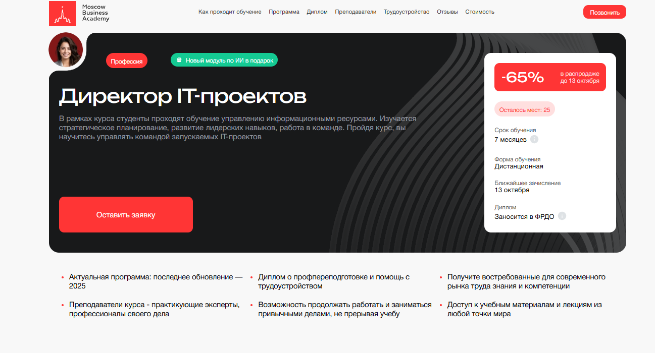- Moscow Business Academy (Директор IT-проектов): гибкая рассрочка до 36 мес., диплом в ФРДО, карьерный центр и поддержка в трудоустройстве.