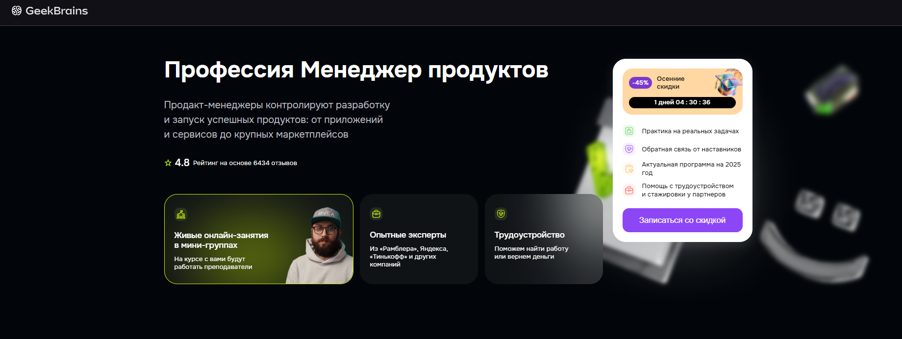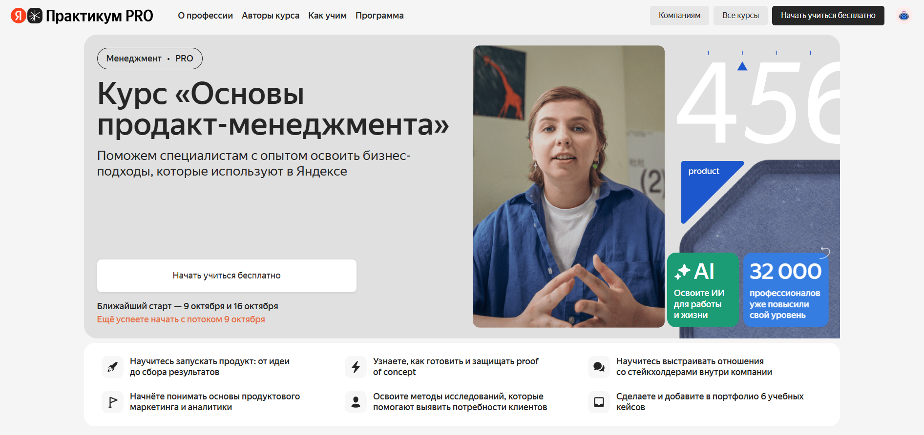 - Яндекс Практикум PRO (Основы продакт-менеджмента): короткий курс (3 мес.), кейсы Яндекса, поддержка peer review и нейросети.