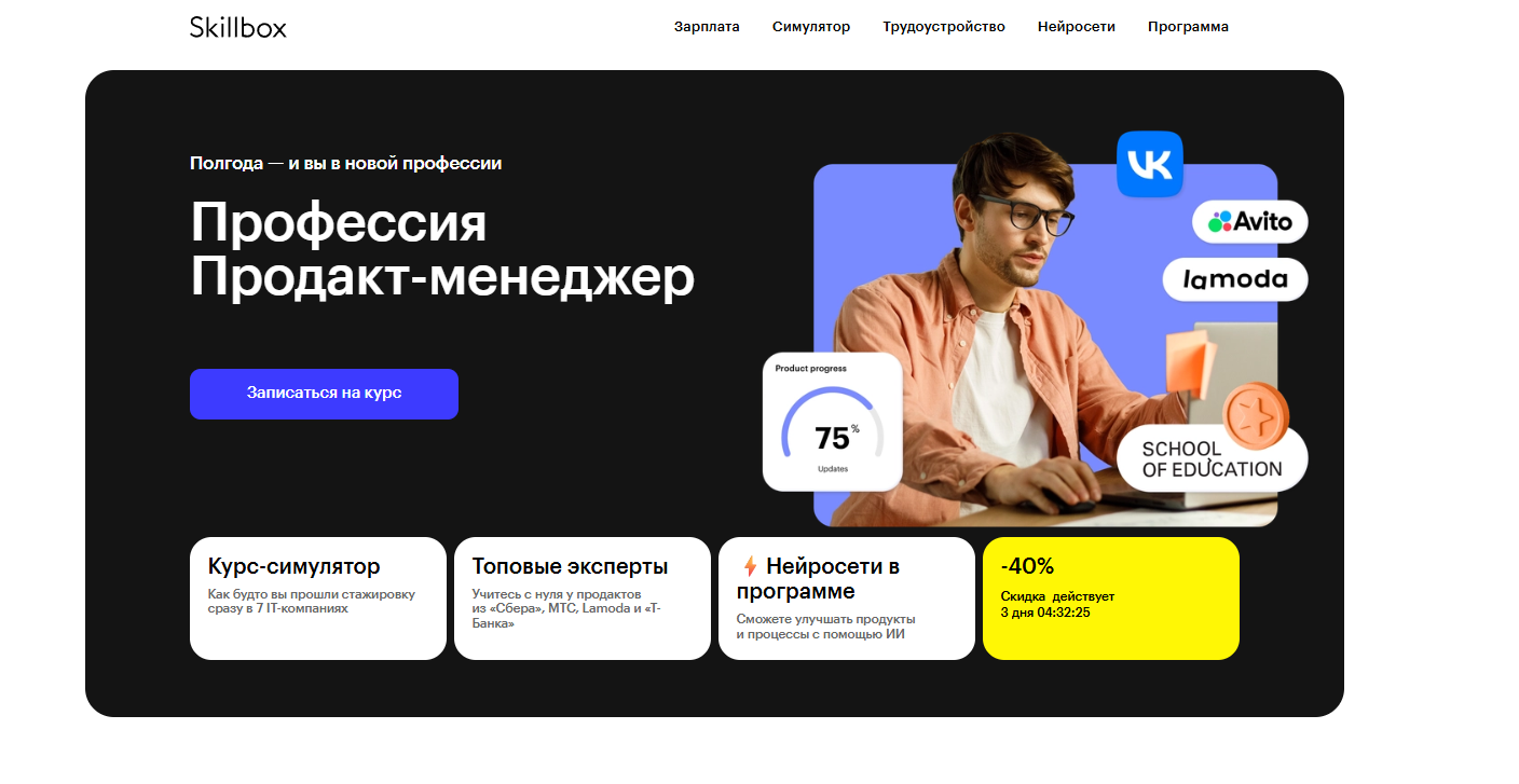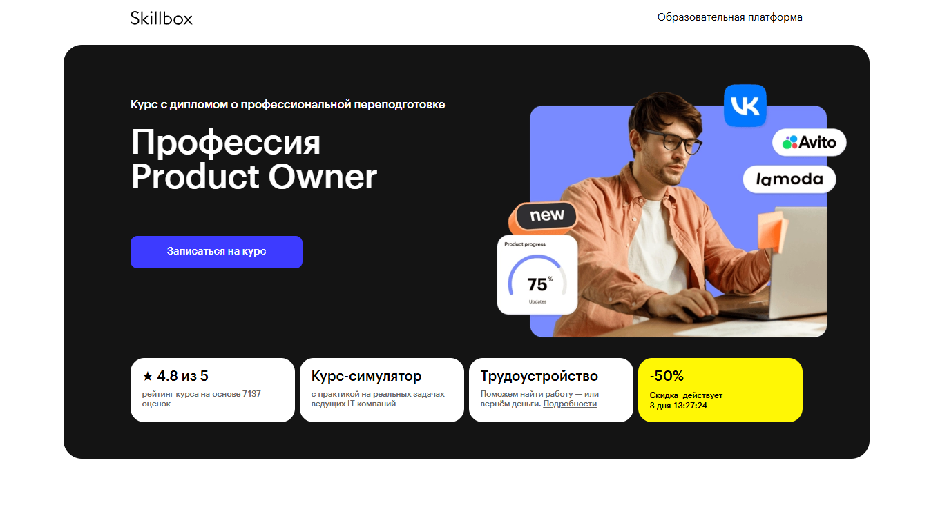 - Skillbox (Product Owner): обучение-симулятор работы, диплом с ФРДО, портфолио из реальных проектов и карьерный центр.