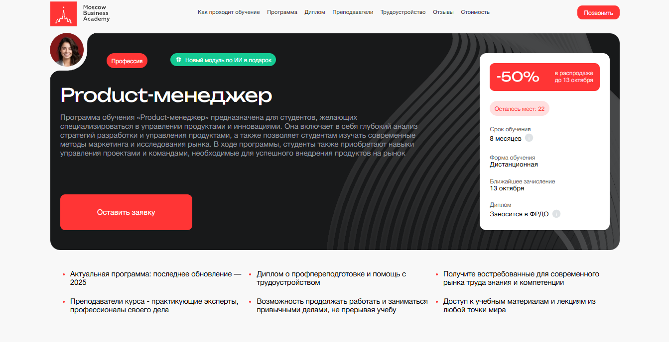 - Product-менеджер – Moscow Business Academy (по промокоду onlinekursy скидка 10%)