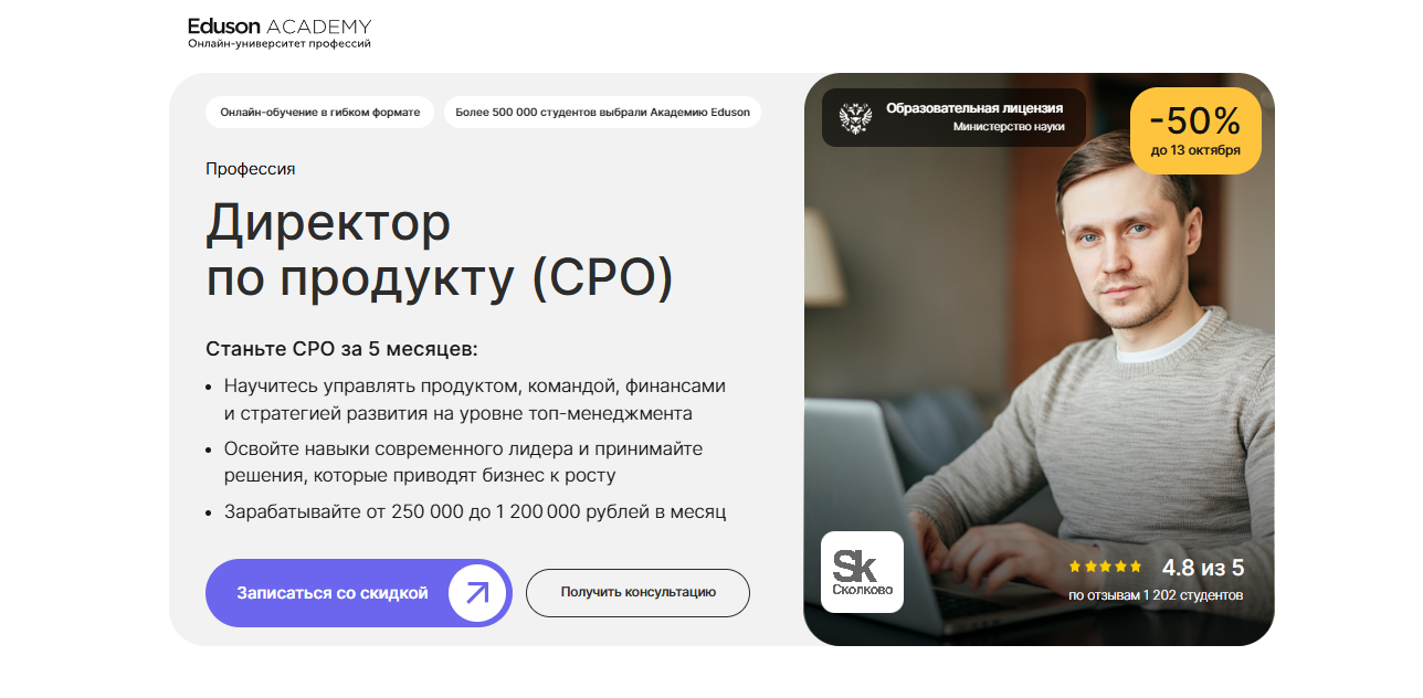 - Директор по продукту (CPO) – Академия Eduson (по промокоду kursy скидка 5%)
