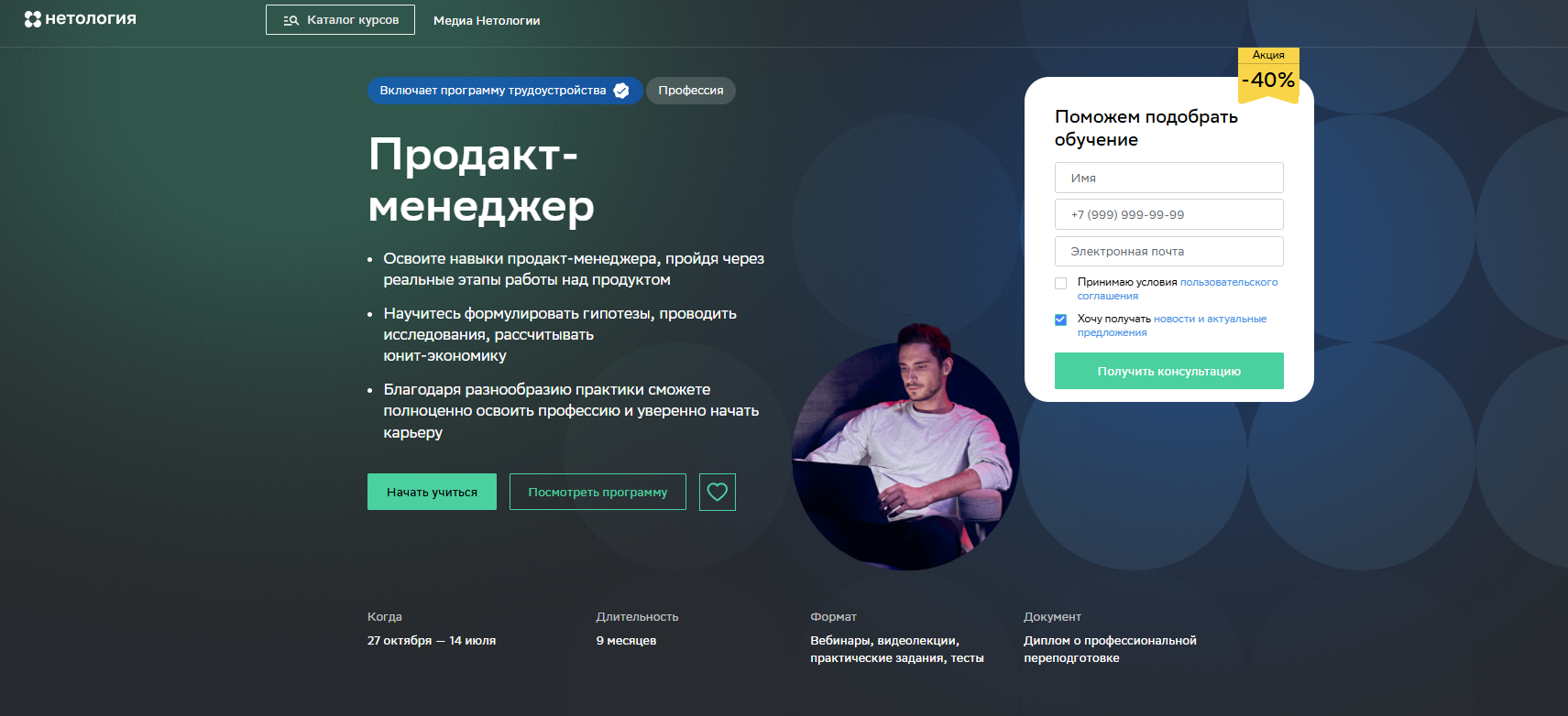 - Программа подходит менеджерам проекта, владельцам продуктов и продакт-менеджерам, которые хотят научиться управлять жизненным циклом продукта.