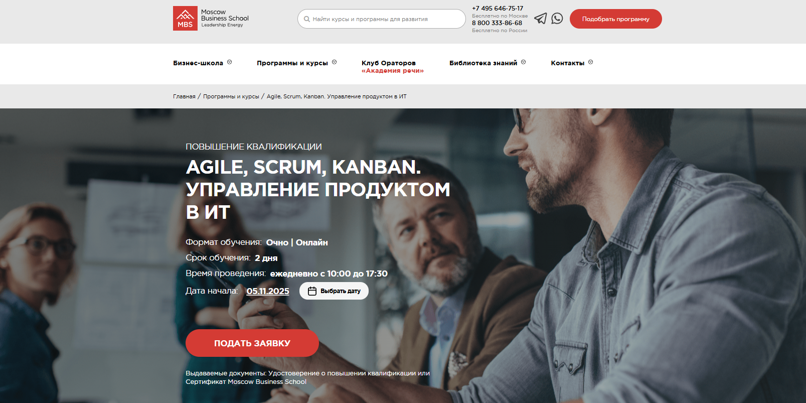 - Moscow Business School (Agile, Scrum, Kanban): очный формат 2 дня, удостоверение о повышении квалификации, акцент на стратегическое управление.