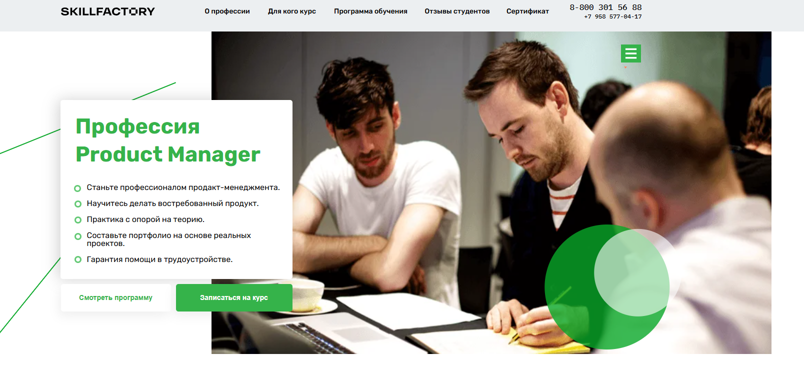 - Skillfactory (Product Manager): стажировка во время курса, диплом и сертификат, карьерная поддержка с гарантией трудоустройства.