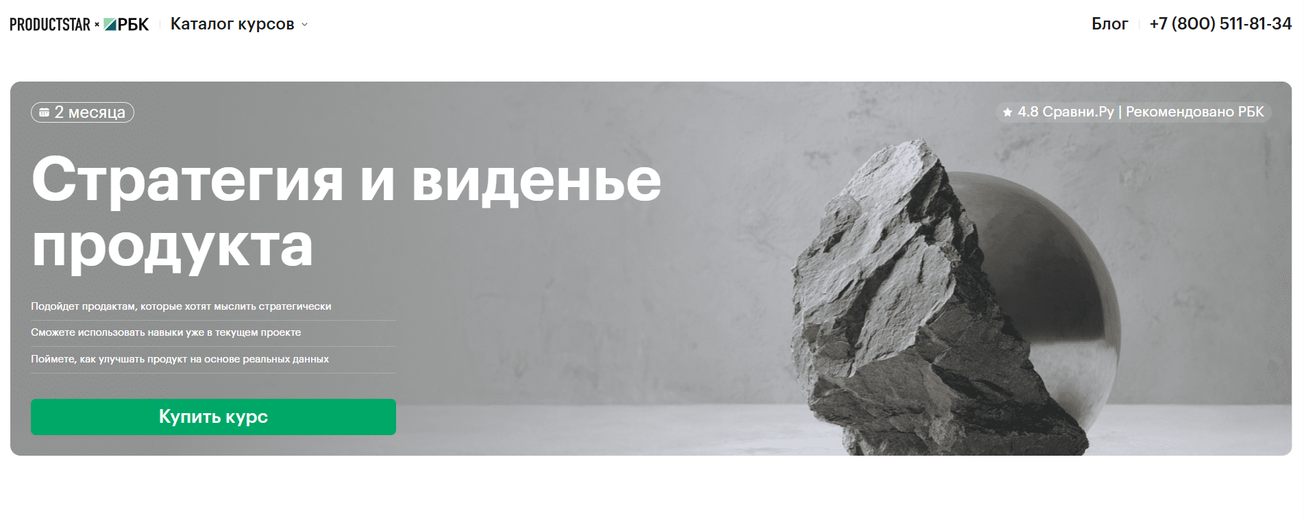 - ProductStar (Стратегия и видение продукта): короткий курс (2 мес.), реальные кейсы + проекты в портфолио, поддержка сообщества специалистов.