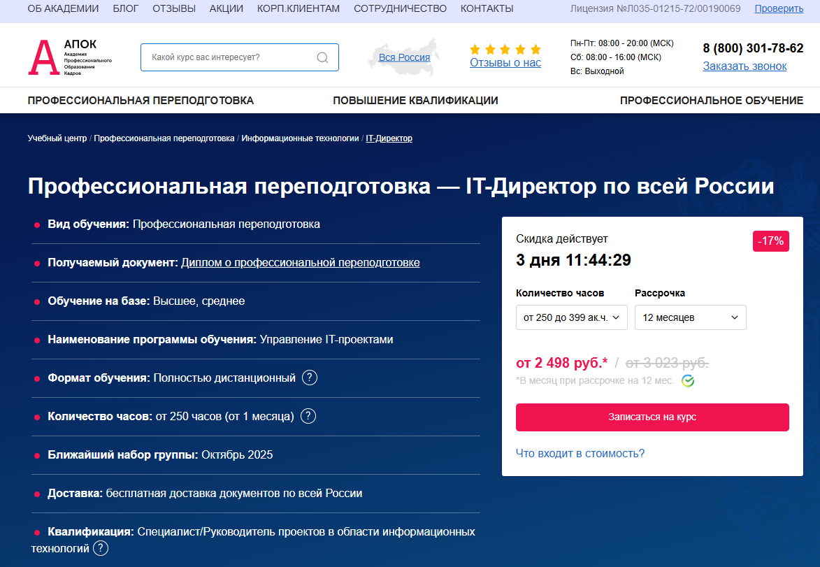 - АПОК: Быстрый старт — от 1 месяца, полностью профильные модули без «воды», бюджетное предложение с дипломом ФРДО.