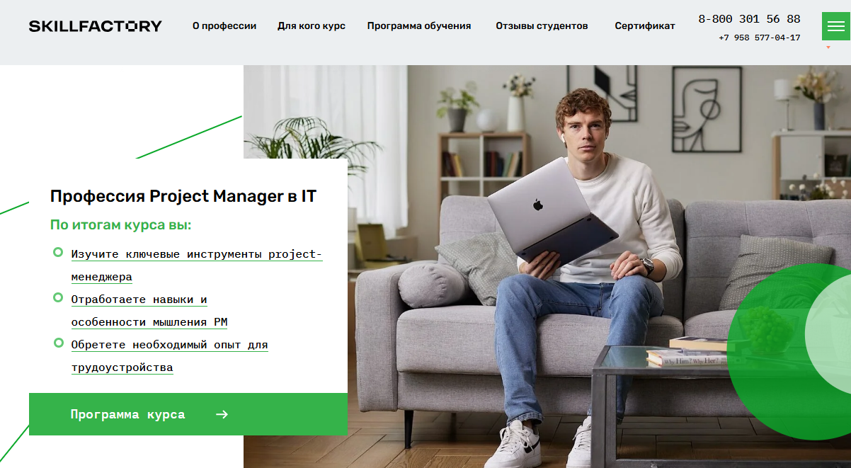 - Skillfactory: Реальные проекты и менторы, симуляторы работы проджект-менеджера, портфолио и стажировки.