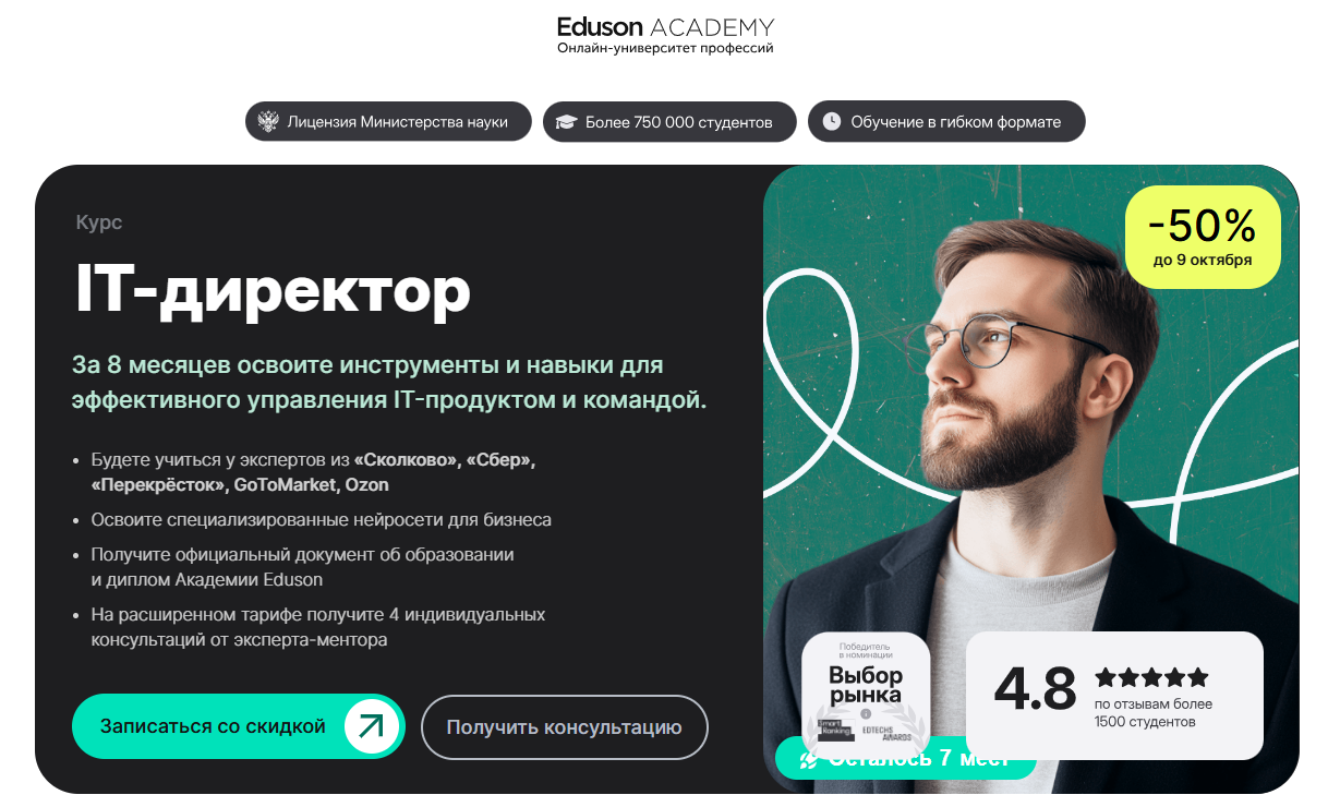 - IT-директор — Академия Eduson (по промокоду kursy скидка 5%)