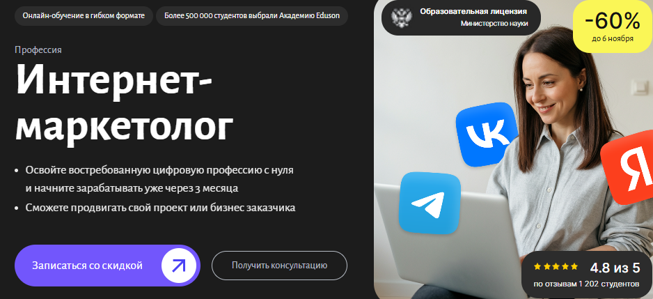 - Интернет-маркетолог — Академия Eduson (по промокоду kursy скидка 5%)