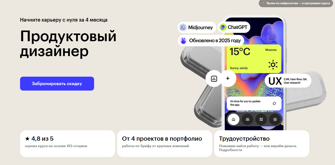 Программа учит создавать удобные интерфейсы для веб-сайтов и мобильных приложений через практическое погружение в реальные задачи. Обучение включает работу с профессиональными инструментами: Figma, Tilda, Webflow, Miro и ChatGPT. Студенты получают навык работы с нейросетями, что повышает их конкурентоспособность на рынке труда на 41%. За время учебы создается портфолио из 12 полноценных работ, включая кейсы от крупных компаний. Практика проходит с реальными заказчиками: Альфа-Банк, Т-Банк, Авито, Сбербанк, IVI, Kaspersky и другие лидеры IT-сектора. Преподаватели – действующие дизайн-лиды и руководители из Яндекса, VK, Райффайзена, Сбера, МТС, что гарантирует актуальность знаний. После окончания студенты получают индивидуальную помощь в трудоустройстве и грант на 15 000 ₽ для начала карьеры.