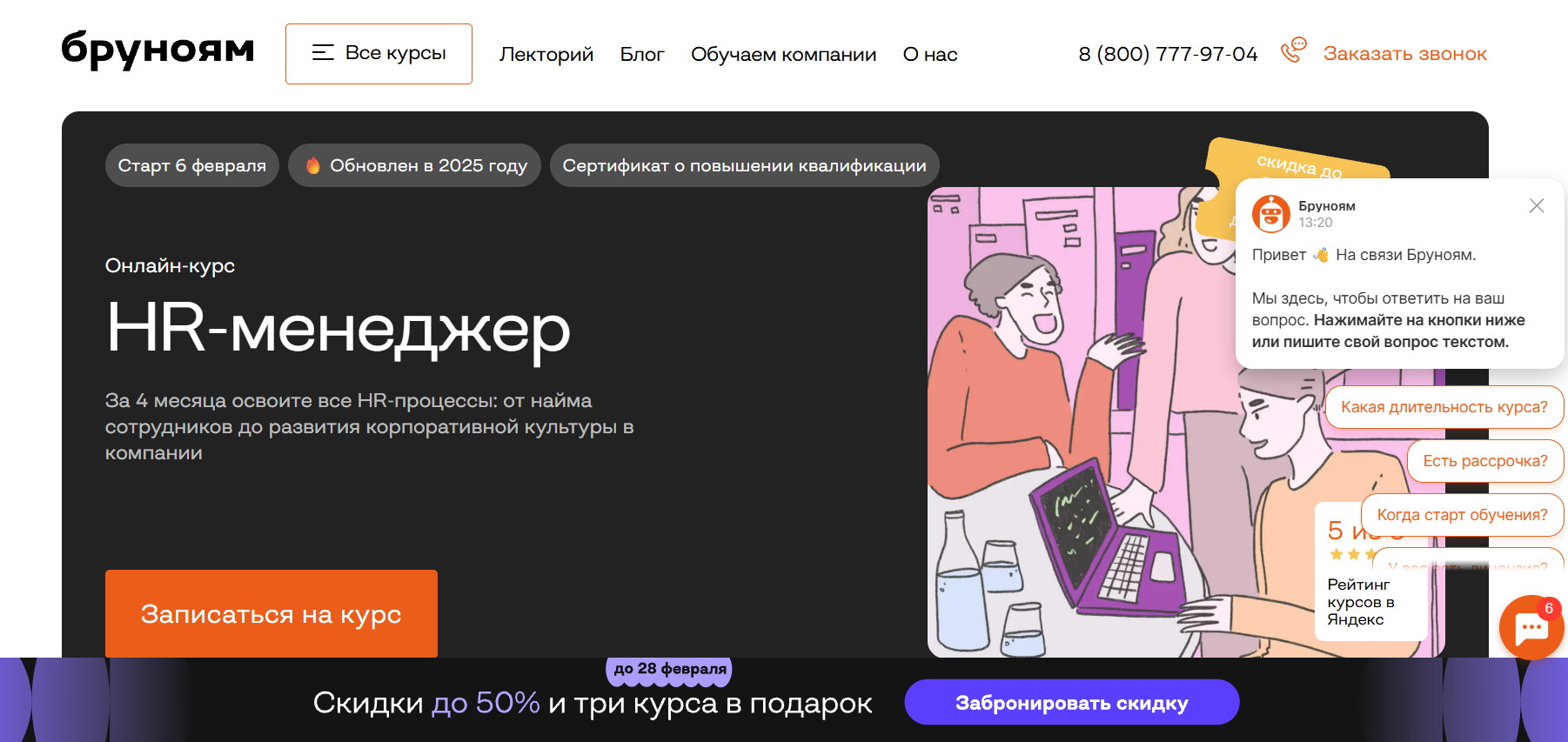 HR-менеджер — Бруноям: Мини-группы, общение с преподавателями, обновления раз в 3 месяца, упор на digital HR, поддержка карьерного центра и практика с наставником.