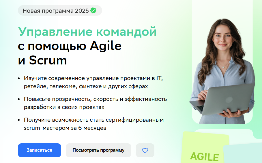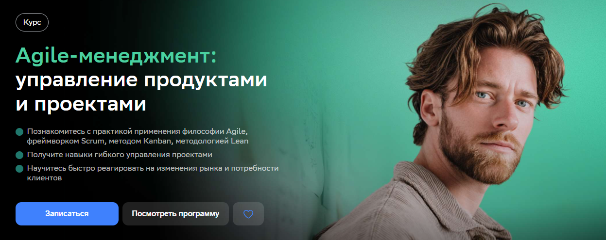 - Нетология — «Agile-менеджмент: управление продуктами и проектами»: 4 месяца с большим объёмом практики и итоговым проектом «план внедрения Agile»; сильный продуктовый контур (roadmap/backlog) + Lean/Kanban.