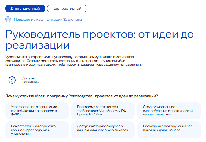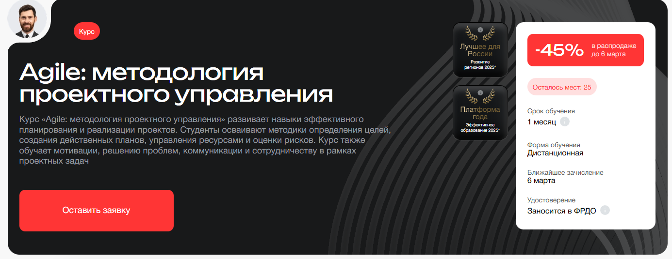 - Московская Бизнес Академия: быстрый вход за 1 месяц + удостоверение с занесением в ФРДО; акцент на внедрение Agile/Scrum/Kanban в цифровой среде и обновление материалов в 2026.