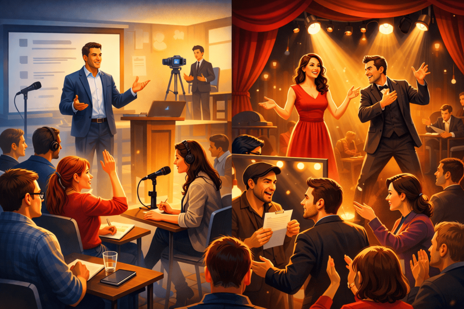 На очных курсах студенты обучаются в живом контакте, учатся управлять вниманием аудитории и мимикой в реальном времени. В онлайне больше гибкости и возможностей совмещать обучение с работой. Оба формата помогают освоить техники актерского мастерства и сценического искусства, развить навыки уверенной самопрезентации и эффективного общения.