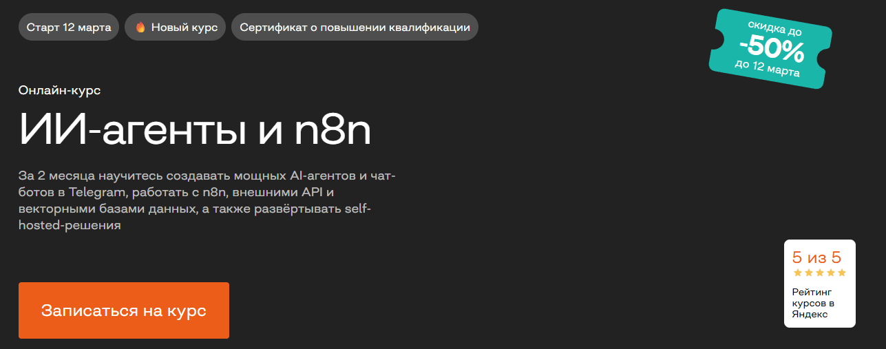 Бруноям — наиболее сфокусирован на самой платформе n8n, ее установке, развёртывании, работе с узлами, Docker, API, Cloud и Self-Hosted-сценариях. Выделяется глубиной именно в AI-агентах, интеграциях, RAG-пайплайнах и векторных базах данных, а также большим объёмом практики и проектной работой.