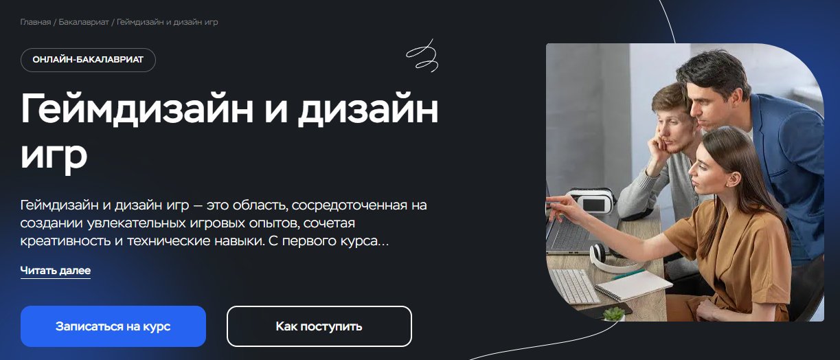 - Для кого подходит курс: выпускникам школ, абитуриентам, которые хотят получить высшее и профильное образование в сфере дизайна, освоить профессию геймдизайнера, развить навыки программирования, работать в игровых студиях и выйти в игровую индустрию.