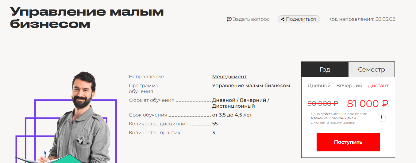 - Для кого подходит курс: абитуриентам с профессиональным или средним профессиональным образованием, тем, кто планирует управлять собственным бизнесом, работать менеджером или развиваться в сфере предпринимательства.