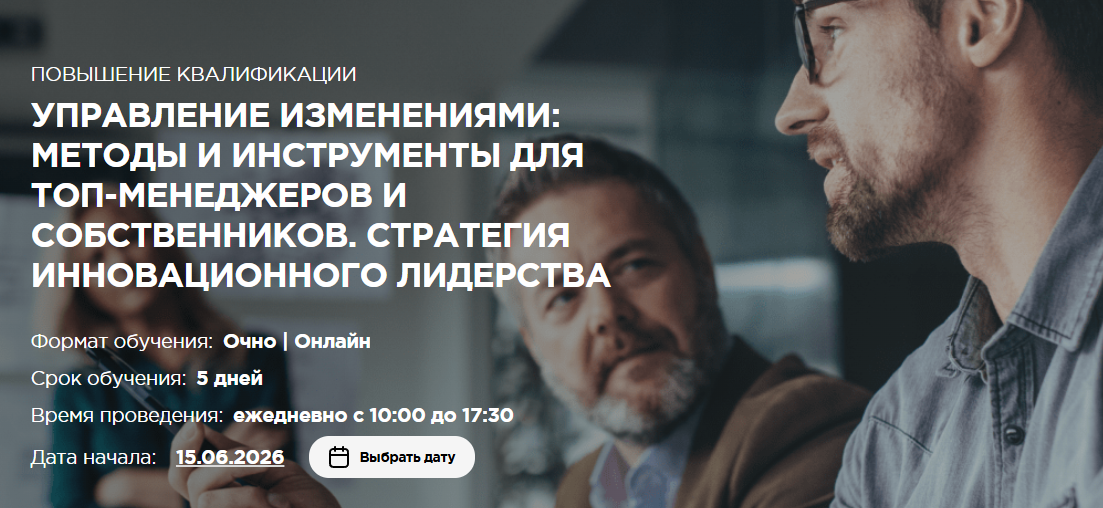 - Управление изменениями: методы и инструменты для ТОП-менеджеров и собственников. Стратегия инновационного лидерства — Moscow Business School (по промокоду onlinekursy10 скидка 10%)