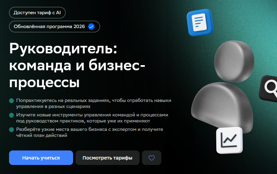- Нетология — Сильнее других выглядит в развитии руководителей среднего звена, тимлидов и менеджеров, которым нужно выстроить команду, процессы и личную управленческую систему, а не только получить статусный диплом. Отличается вариативностью тарифов, современным digital-форматом обучения, удобным входом по цене и наличием отдельных треков с ИИ-инструментами и корпоративным обучением.