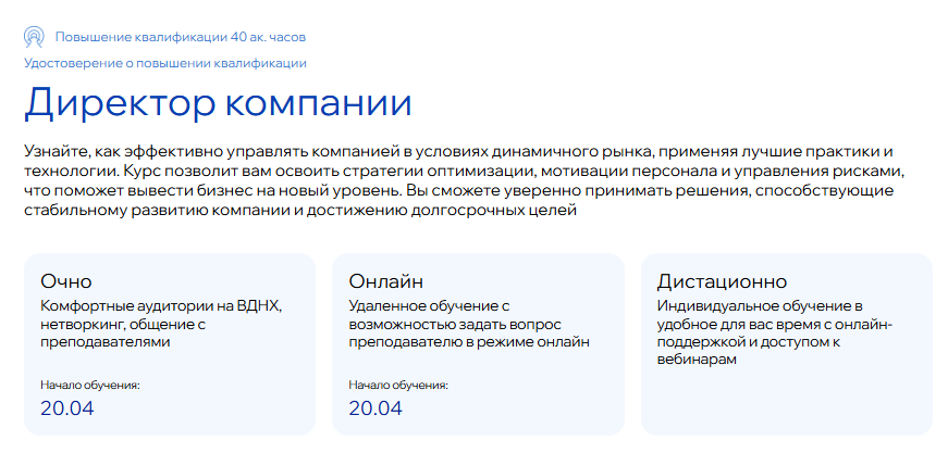 - Для кого подходит курс: опытным руководителям, директорам разного уровня, предпринимателям, владельцам бизнеса и тем, кто хочет усилить управленческие навыки и повысить эффективность компании.